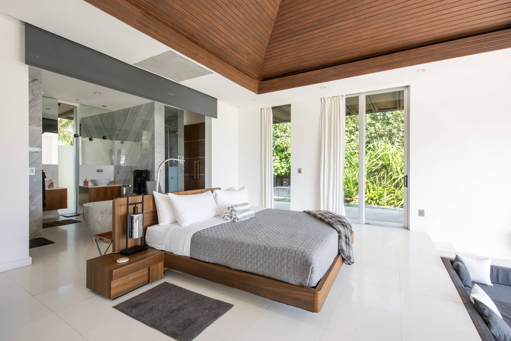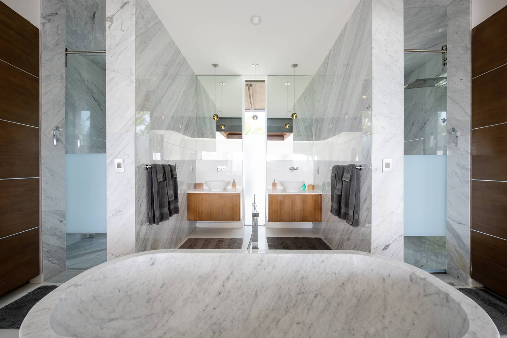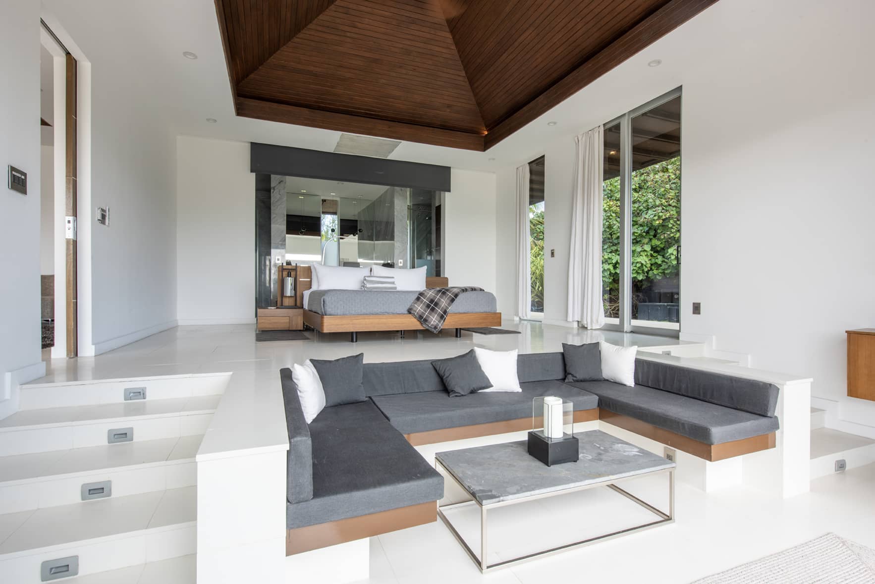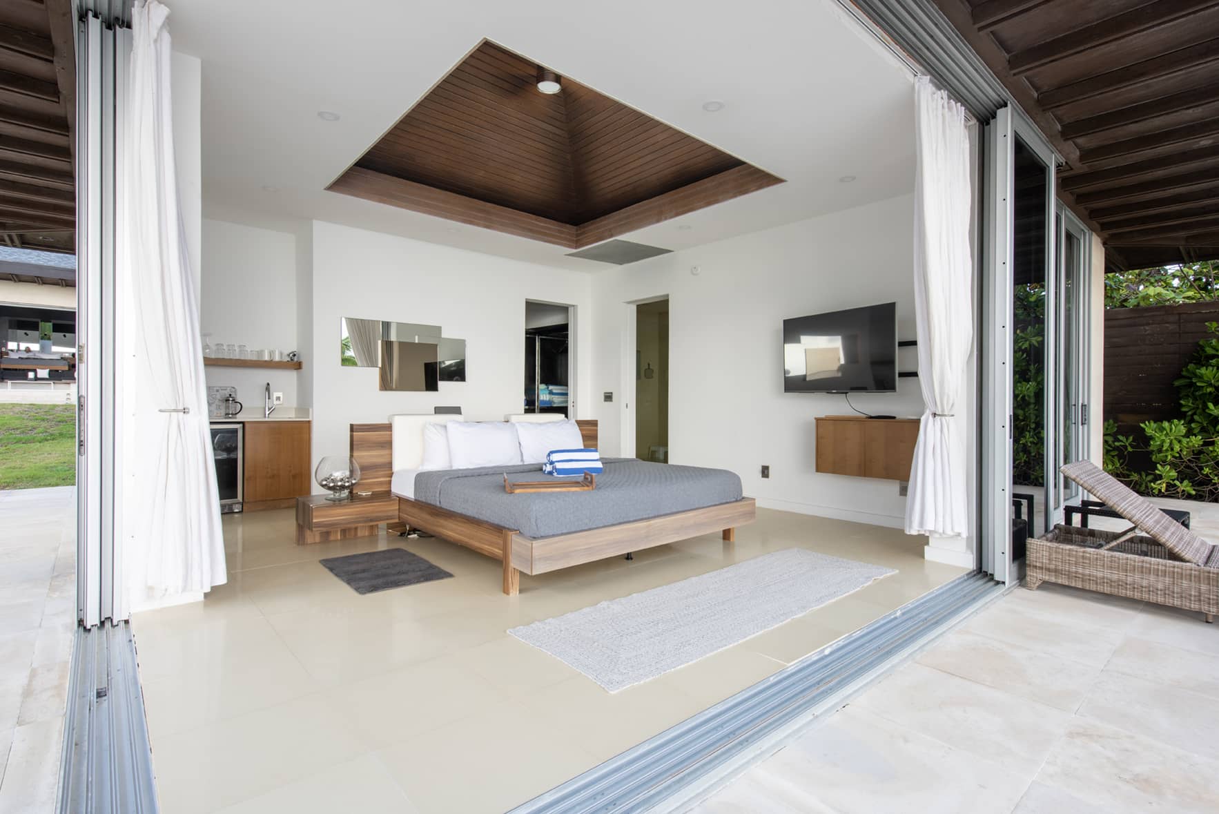 Ananda’s two pavilions are stand-alone master bedroom suites. They feature fully retractable glass curtain walls with sweeping views of the ocean. Each pavilion has a full-size walk-in closet and an ultra-luxury master bath with Caesar stone walls and floors, top of the line luxury Hansgrohe Axor fixtures, and solid marble stand-alone tubs.