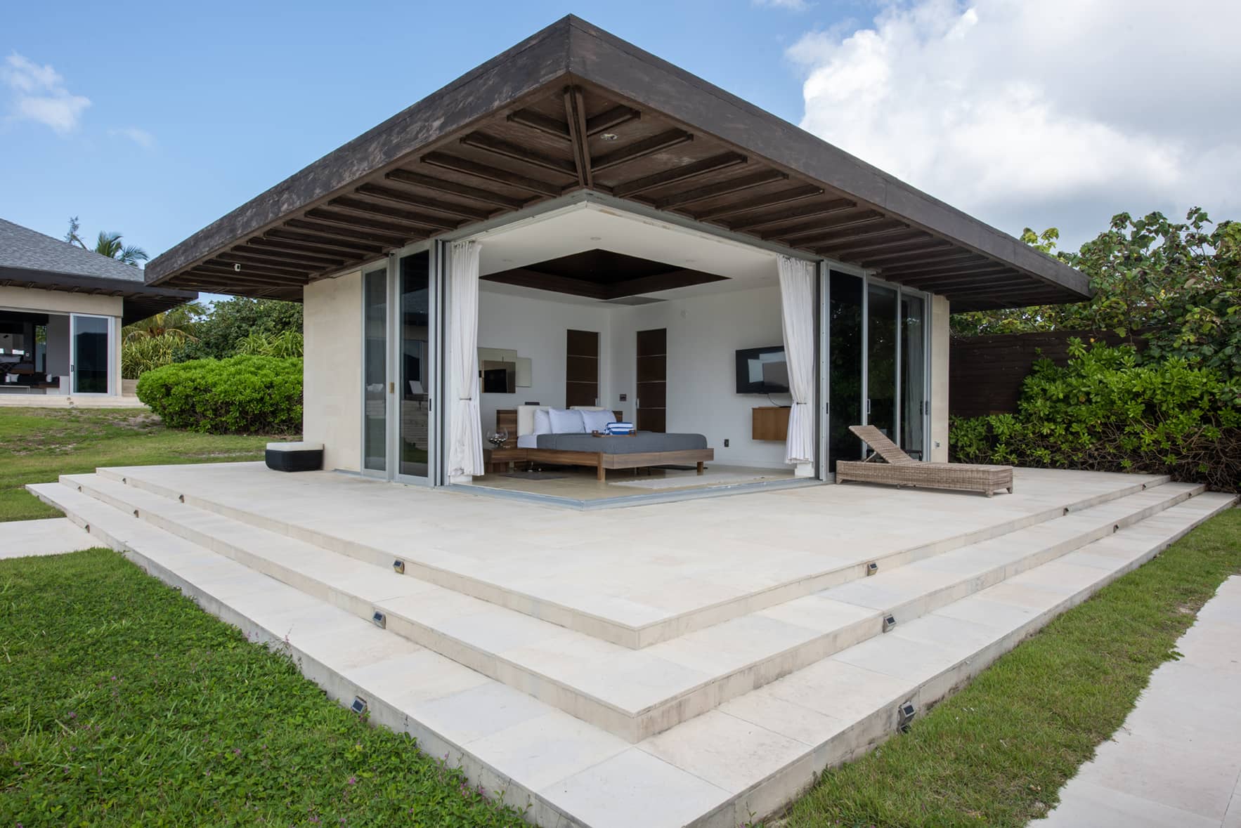 This living area is flanked by two magnificent master bedroom suites with 20-foot vaulted ceilings. Each suite has a wall of glass with a sweeping view of the ocean. Amenities include 55-inch 4k 3D TV. The ultra-luxury bathrooms feature Caesar stone and Carrara White slab walls and floors, top-of-the-line Hansgrohe Axor fixtures, and stand-alone tubs carved of solid Carrara marble. The bedrooms are furnished with Italian furniture.These main house bedrooms each include a lower built-in area for lounging or for use as additional sleeping quarters. There is also a rollaway bed available for a 9th guest.